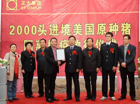 放行儀式上,陜西出入境檢驗檢疫局代表做了檢疫放行報告:“經(jīng)過3個多月的隔離檢驗,正大集團農(nóng)牧食品企業(yè)(中國區(qū))引進的2000頭原種豬完全符合安全檢疫標(biāo)準(zhǔn),準(zhǔn)予放行?!标兾鞒鋈刖硻z驗檢疫局代表為正大集團陜西區(qū)陳強總裁頒發(fā)了《種豬檢疫合格證書》。