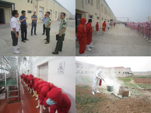 吉林德惠寶源豐禽業(yè)發(fā)生特大事故,造成120人遇難,在全國安全月伊始之時發(fā)生如此重大事故,教訓(xùn)慘痛。為吸取這一慘痛的經(jīng)驗教訓(xùn),落實于董事長關(guān)于安全整頓的要求,進一步增強員工安全意識和自我救助能力,公司于2013年6月7日在各分廠車間、制冷機房和廠區(qū)空地三處演習(xí)地點舉行了緊急疏散、液氨泄漏緊急處置和消防滅火的實戰(zhàn)演練。